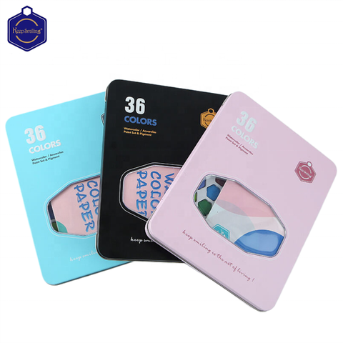 Tetap tersenyum 36 warna anak-anak, Set kotak besi hitam tidak beracun portabel cat air padat untuk menggambar pemula